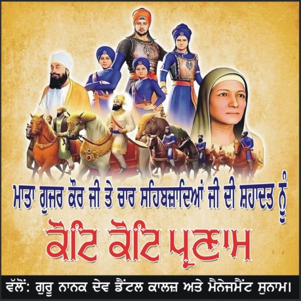 ਗੁਰੂ ਨਾਨਕ ਦੇਵ ਡੈਂਟਲ ਕਲਾਜ ਦੇ ਸਮੂਹ ਸਟਾਫ ਅਤੇ ਮੈਨੇਜਮੈਂਟ ਵੱਲੋਂ ਮਾਤਾ ਗੁਜਰੀ ਜੀ ਅਤੇ ਛੋਟੇ ਸਾਹਿਬਜ਼ਾਦਿਆਂ ਦੀ ਸ਼ਹਾਦਤ ਨੂੰ ਕੋਟਿ ਕੋਟਿ ਪ੍ਰਣਾਮ। ਵਾਹਿਗੁਰੂ ਜੀ ਆਪ ਸਭ ਦੇ ਜੀਵਨ ਵਿੱਚ ਨਾਮ ਬਾਣੀ ਅਤੇ ਖੁਸ਼ੀਆਂ ਦਾ ਪ੍ਰਕਾਸ਼ ਕਰਦੇ ਰਹਿਣ ।
